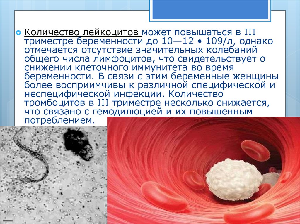 Количество лейкоцитов может повышаться в IIIтриместре беременности до 10—12 • 109/л, однако