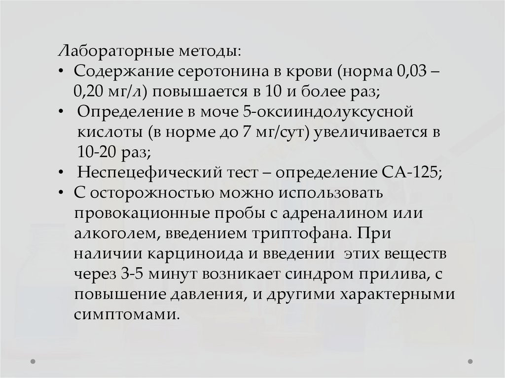 Лабораторные методы:• Содержание серотонина в крови (норма 0,03 –
