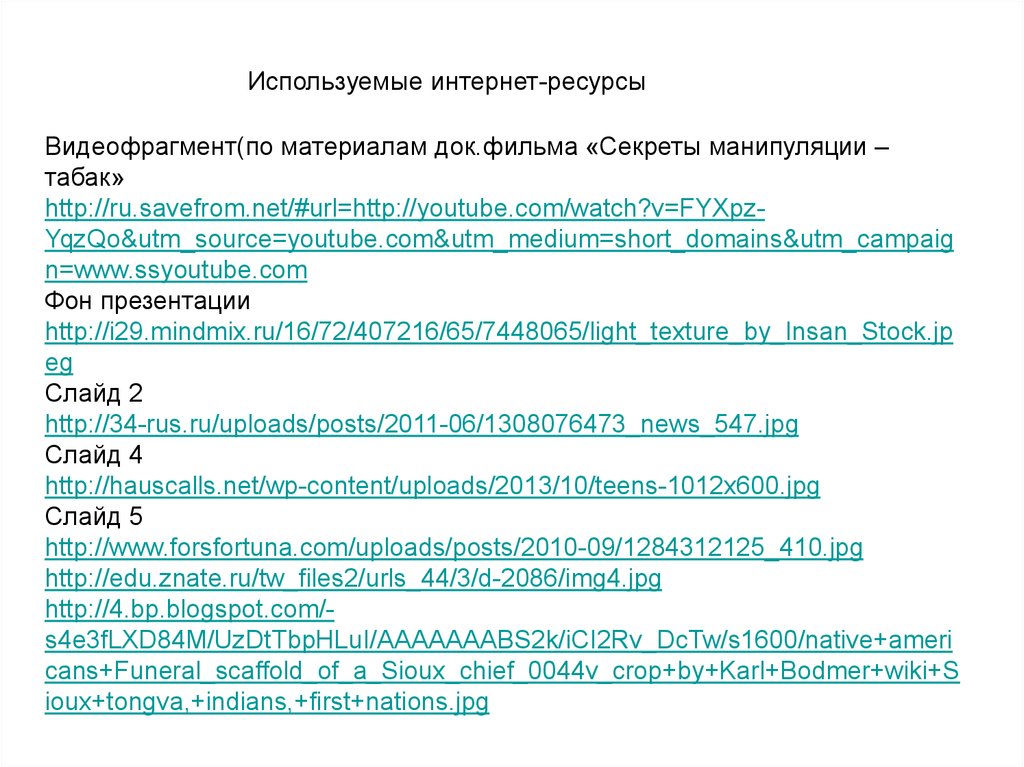 Используемые интернет-ресурсыВидеофрагмент(по материалам док.фильма «Секреты манипуляции –