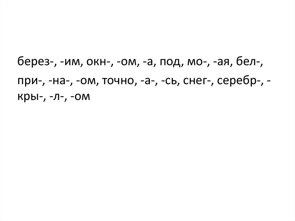 берез-, -им, окн-, -ом, -а, под, мо-, -ая, бел-,при-, -на-, -ом, точно, -а-, -сь, снег-, серебр-, кры-, -л-, -ом