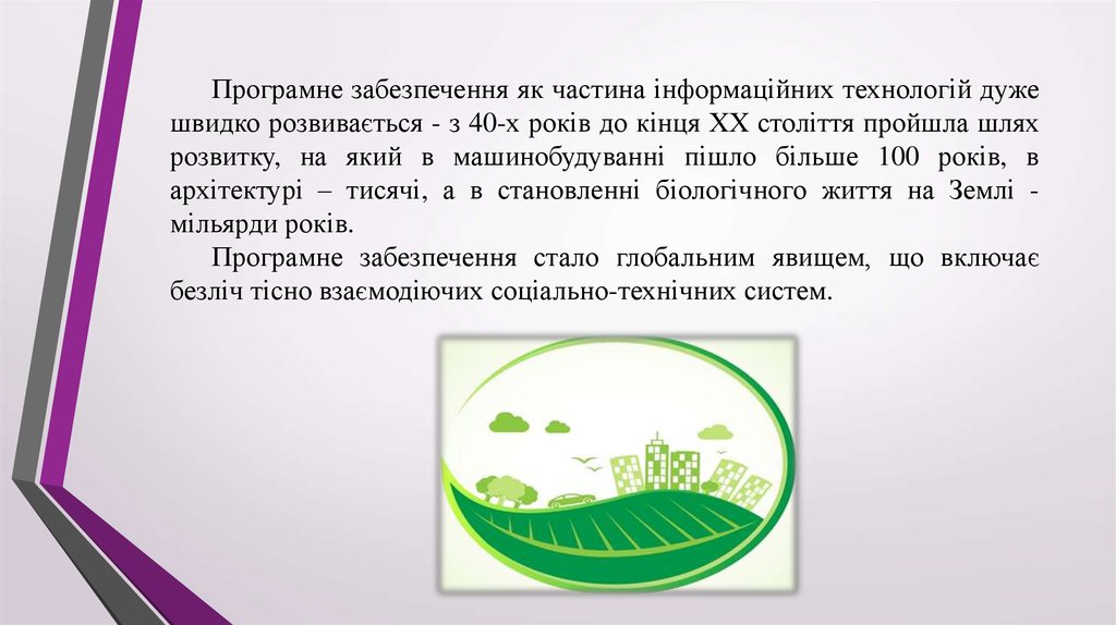 Програмне забезпечення як частина інформаційних технологій дужешвидко розвивається - з 40-х років до кінця ХХ століття пройшла шлях