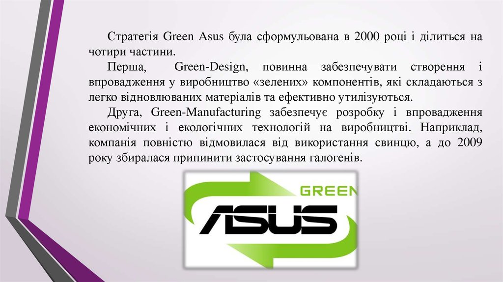 Стратегія Green Asus була сформульована в 2000 році і ділиться начотири частини.