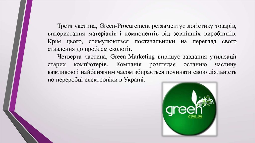 Третя частина, Green-Procurement регламентує логістику товарів,використання матеріалів і компонентів від зовнішніх виробників.