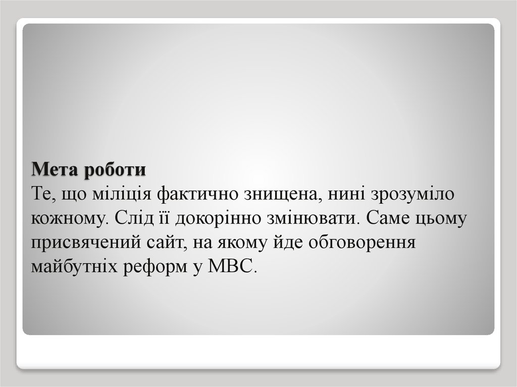 3. Мета роботи Те, що міліція фактично знищена, нині зрозуміло кожному. Слід її докорінно змінювати. Саме цьому присвячений сайт, на якому йде