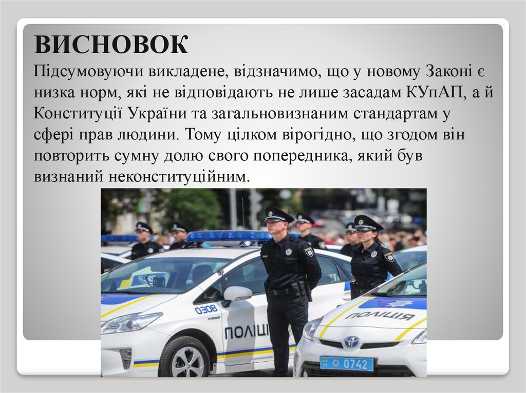 8. ВИСНОВОК Підсумовуючи викладене, відзначимо, що у новому Законі є низка норм, які не відповідають не лише засадам КУпАП, а й Конституції Укр