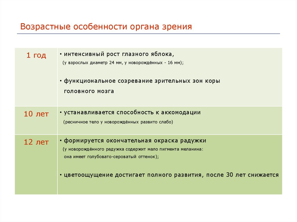 • цветоощущение достигает полного развития, после 30 лет снижается