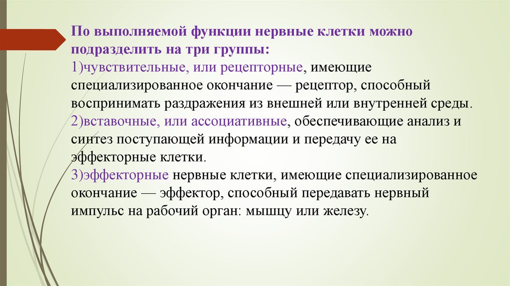 По выполняемой функции нервные клетки можноподразделить на три группы: