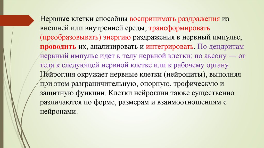 Нервные клетки способны воспринимать раздражения извнешней или внутренней среды, трансформировать