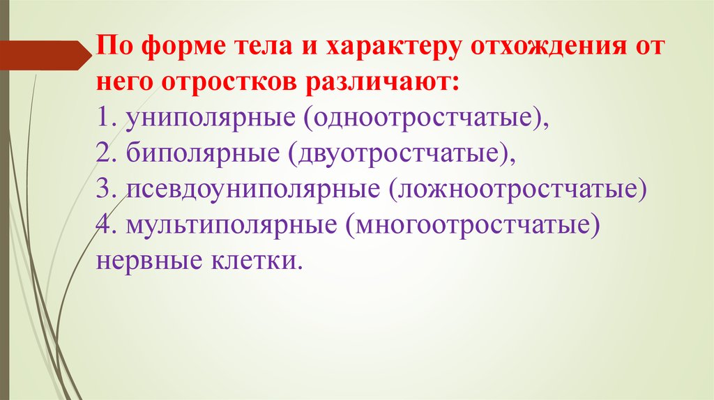Каждая нервная клетка состоит из тела с ядром, особыхвключений и нескольких коротких древовидно- ветвящихся