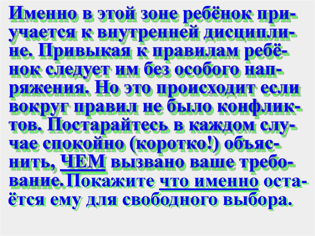 Именно в этой зоне ребёнок приучается к внутренней дисциплине. Привыкая к правилам ребёнок следует им без особого напряжения. Но это происходит есливокруг правил не было конфликтов. Постарайтесь в каждом случае спокойно (коротко!) объяснить, ЧЕМ вызвано ваше требование. Покажите что именно остаётся ему для свободного выбора.