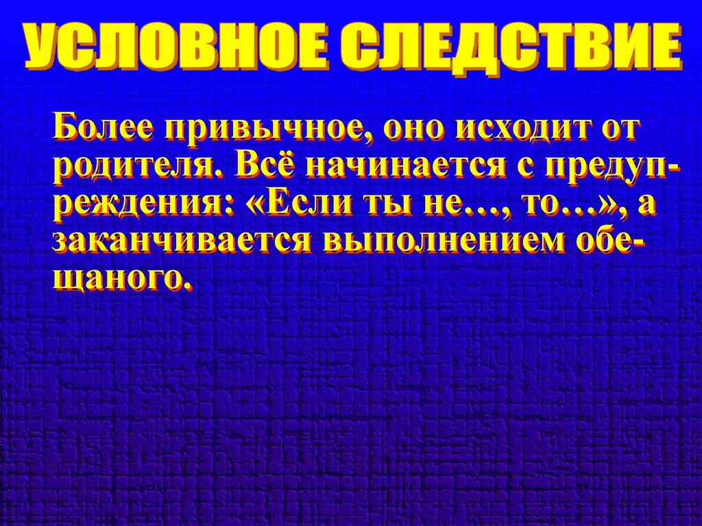 Более привычное, оно исходит отродителя. Всё начинается с предупреждения: «Если ты не…, то…», а