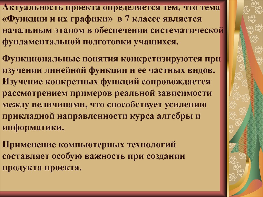 Актуальность проекта определяется тем, что тема«Функции и их графики» в 7 классе является