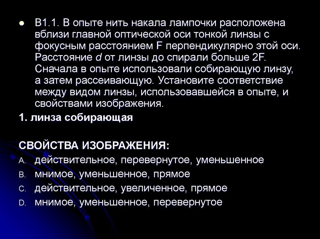 В1.1. В опыте нить накала лампочки расположенавблизи главной оптической оси тонкой линзы с