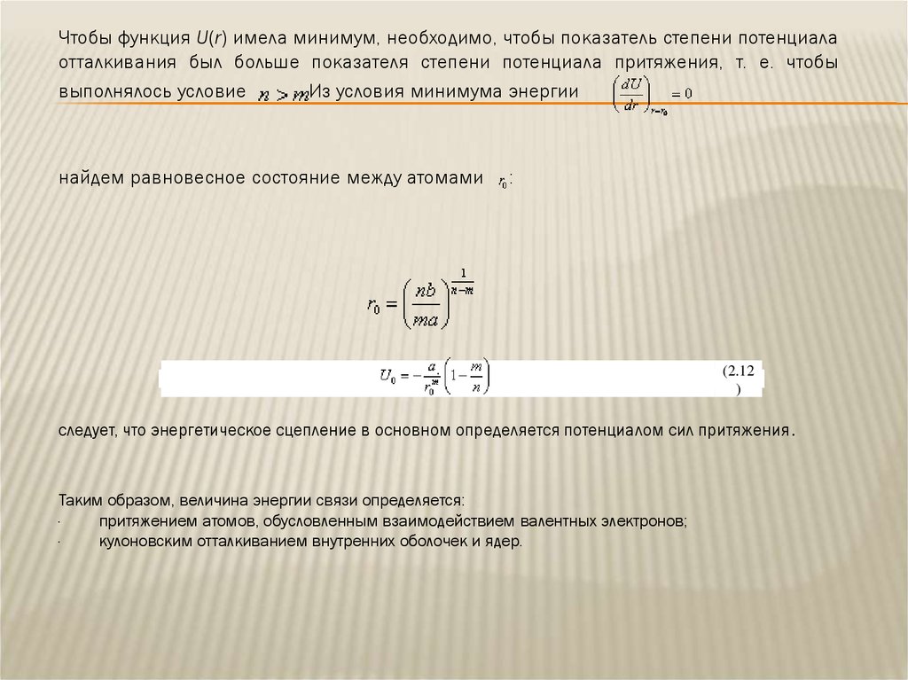 Чтобы функция U(r) имела минимум, необходимо, чтобы показатель степени потенциалаотталкивания был больше показателя степени потенциала притяжения, т. е. чтобы