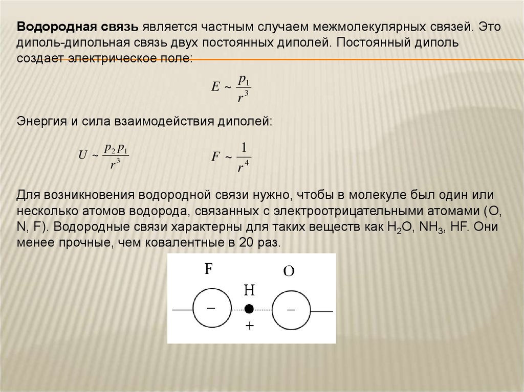 Водородная связь является частным случаем межмолекулярных связей. Этодиполь-дипольная связь двух постоянных диполей. Постоянный диполь