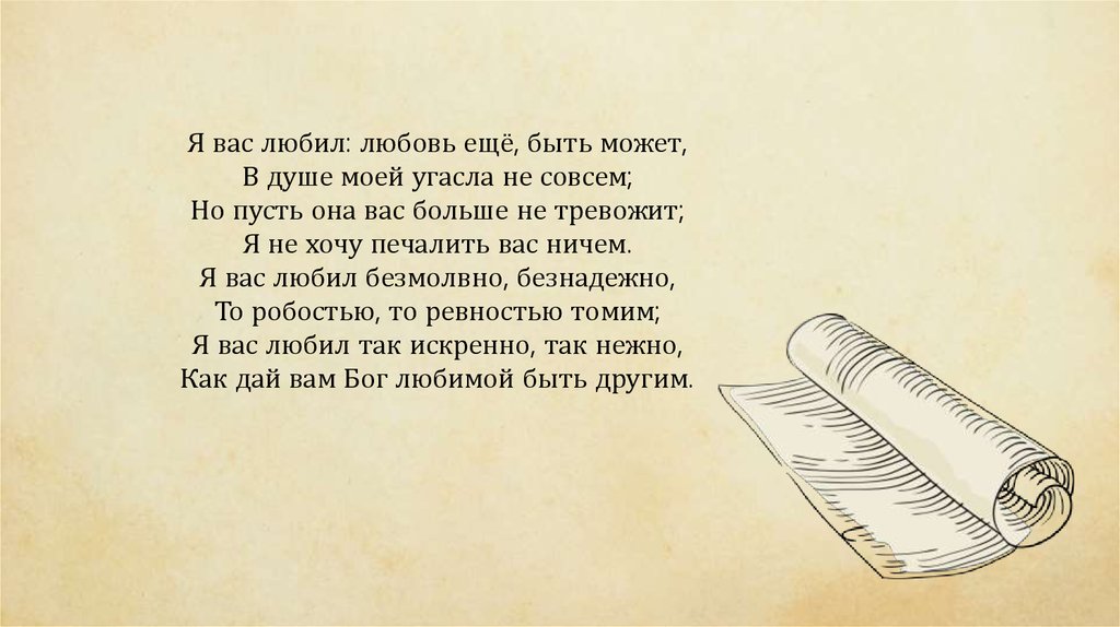 Я вас любил: любовь ещё, быть может,В душе моей угасла не совсем;