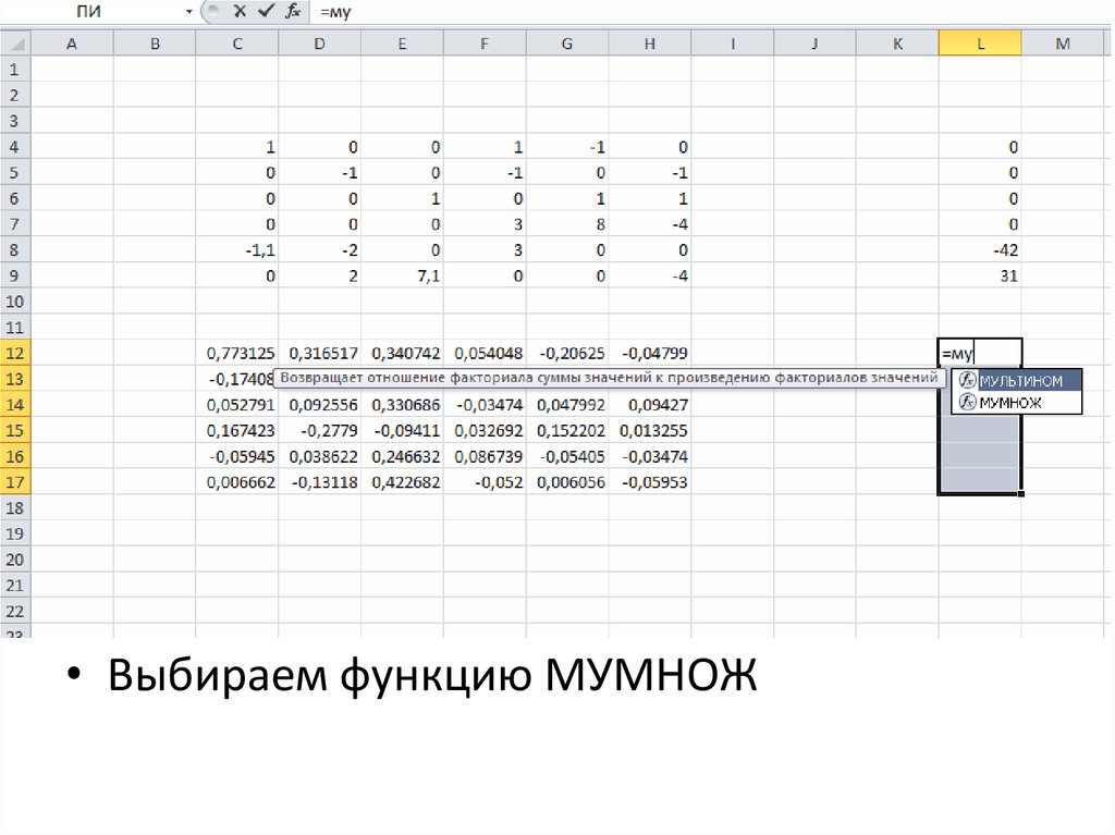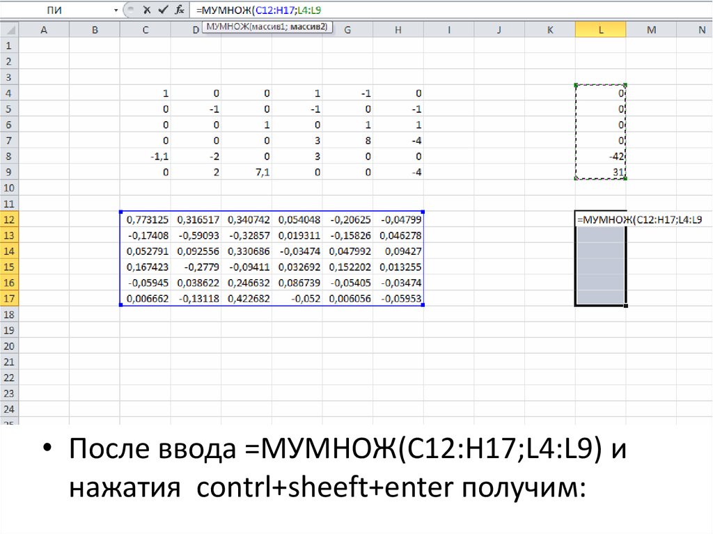 • После ввода =МУМНОЖ(C12:H17;L4:L9) инажатия contrl+sheeft+enter получим: