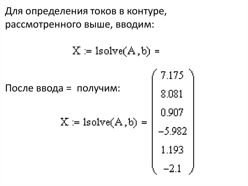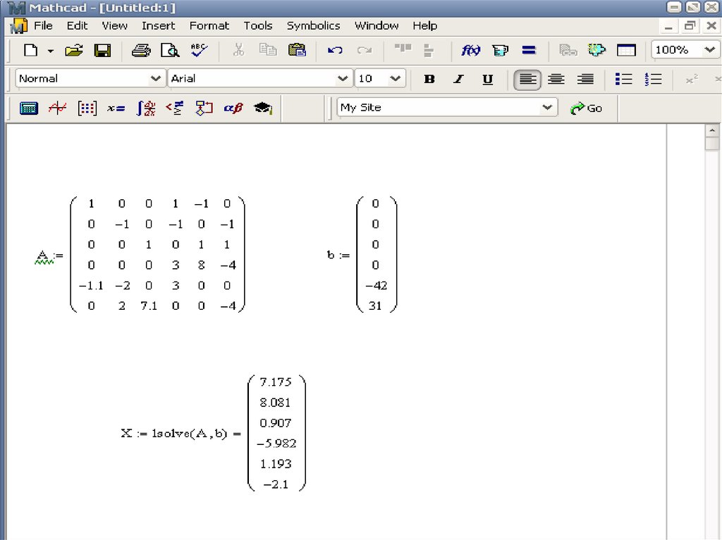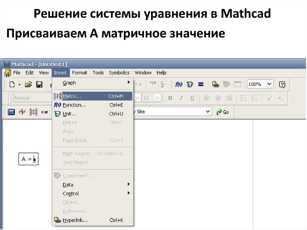 Решение системы уравнения в MathcadПрисваиваем А матричное значение