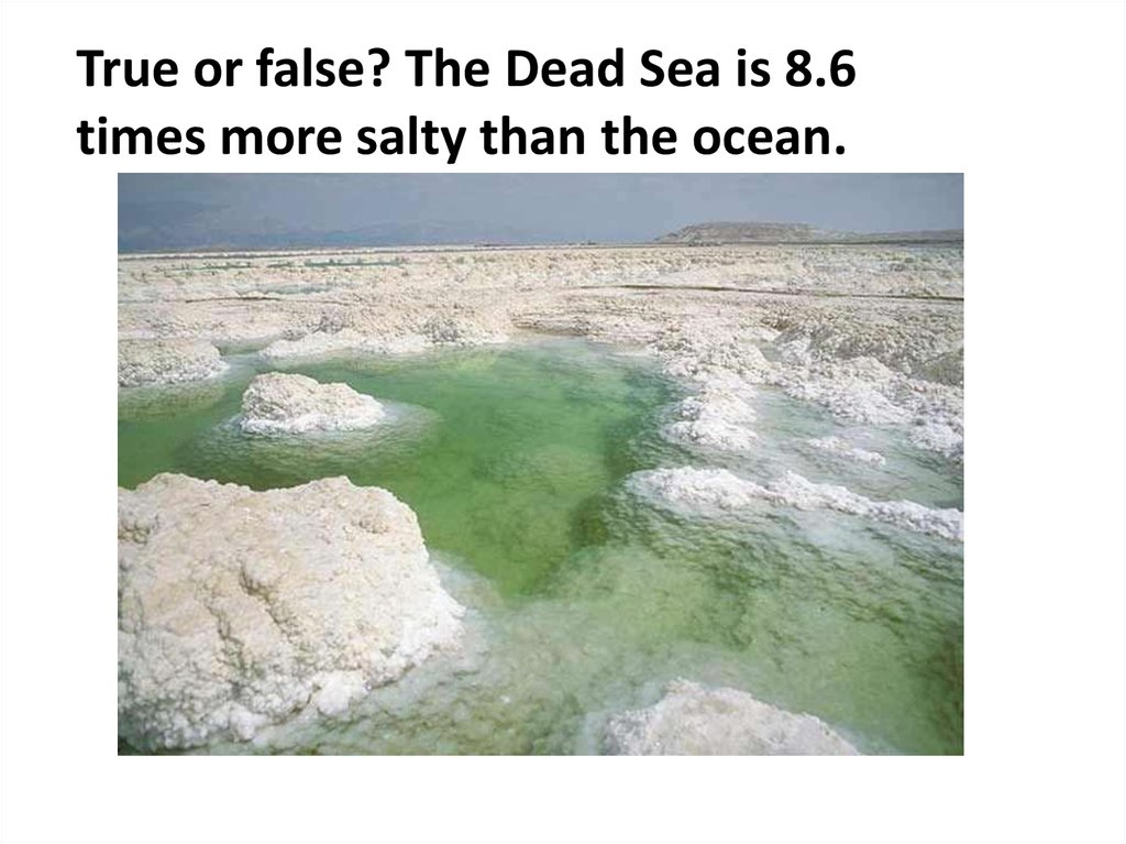 True or false? The Dead Sea is 8.6times more salty than the ocean.