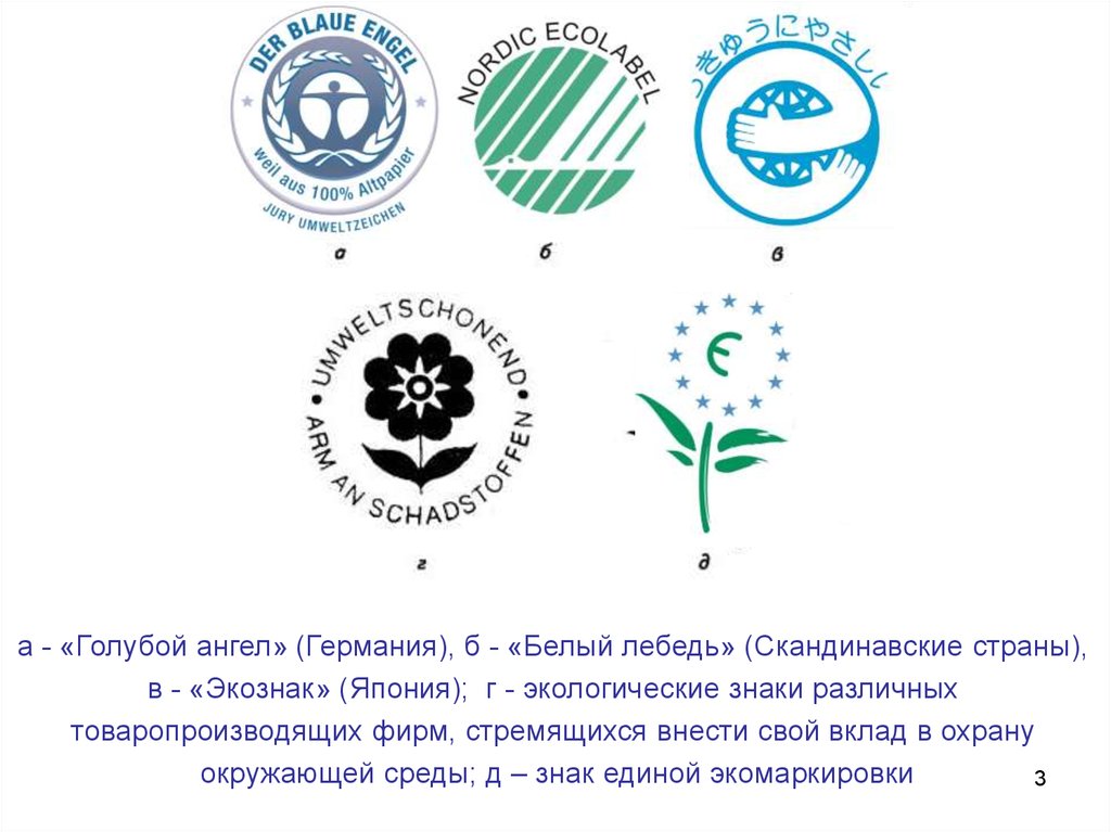 а - «Голубой ангел» (Германия), б - «Белый лебедь» (Скандинавские страны),в - «Экознак» (Япония); г - экологические знаки различных