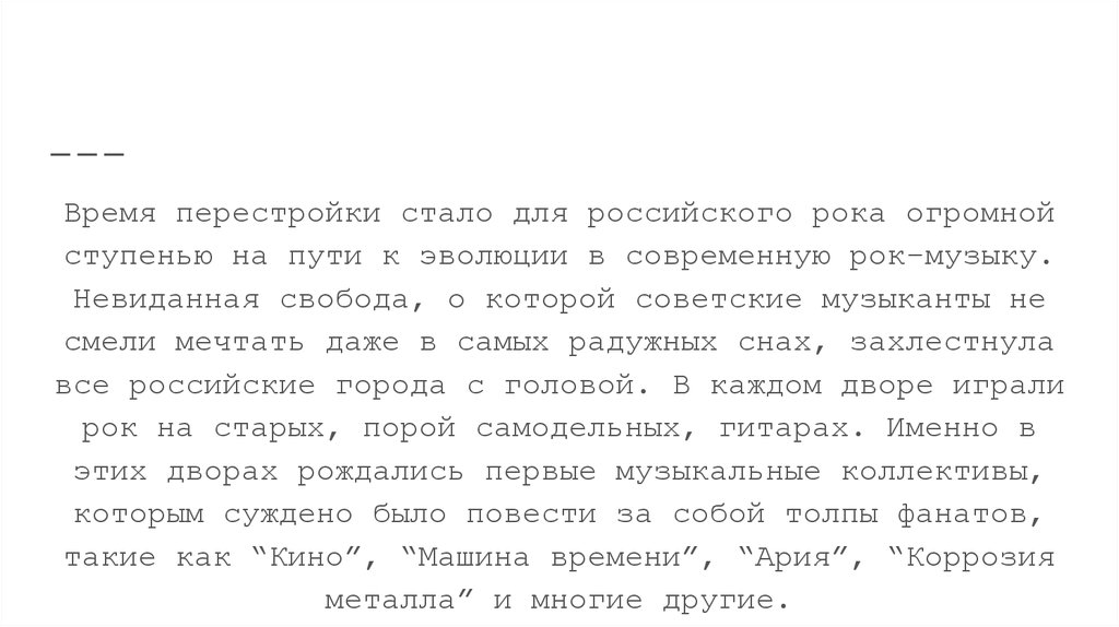 такие как “Кино”, “Машина времени”, “Ария”, “Коррозия