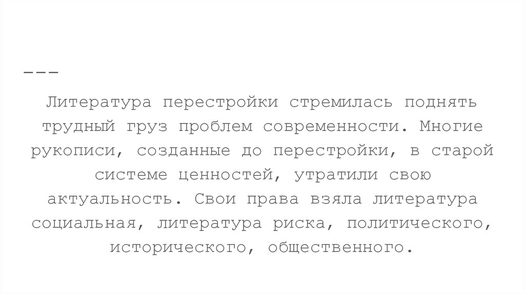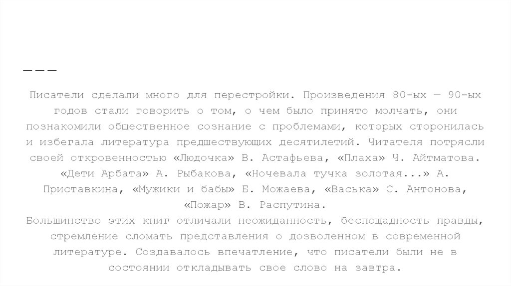 Роль литературы в “перестройке”Писатели сделали много для перестройки. Произведения 80-ых — 90-ых