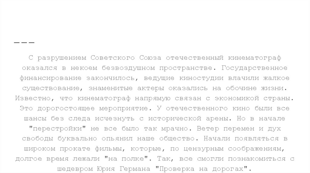 Кино “перестройки”С разрушением Советского Союза отечественный кинематограф