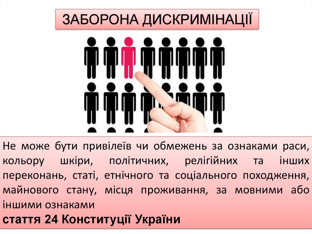 ЗАБОРОНА ДИСКРИМІНАЦІЇНе може бути привілеїв чи обмежень за ознаками раси,