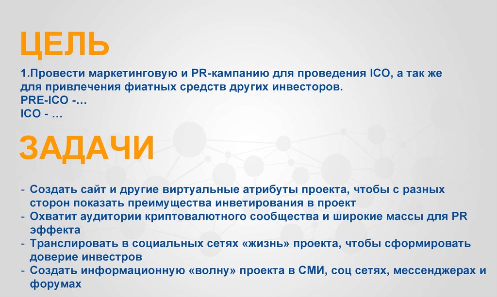 ЦЕЛЬ1.Провести маркетинговую и PR-кампанию для проведения ICO, а так же