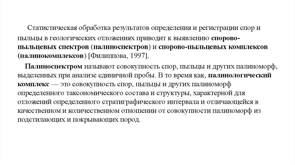 Статистическая обработка результатов определения и регистрации спор ипыльцы в геологических отложениях приводит к выявлению споровопыльцевых спектров (палиноспектров) и спорово-пыльцевых комплексов