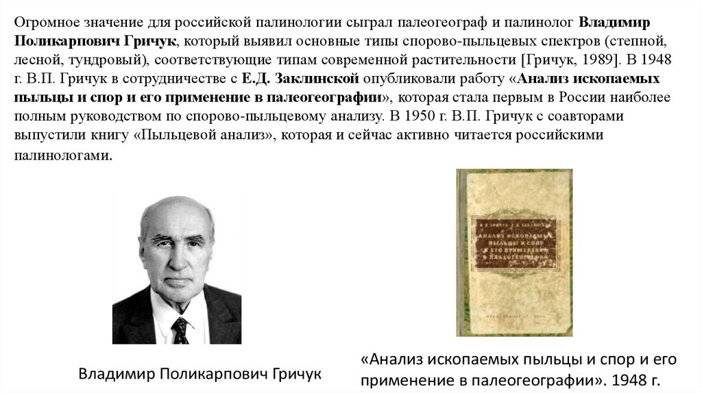 Огромное значение для российской палинологии сыграл палеогеограф и палинолог ВладимирПоликарпович Гричук, который выявил основные типы спорово-пыльцевых спектров (степной,