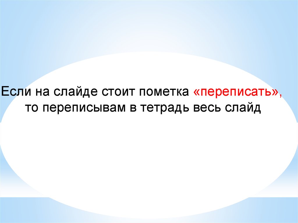 Если на слайде стоит пометка «переписать»,то переписывам в тетрадь весь слайд