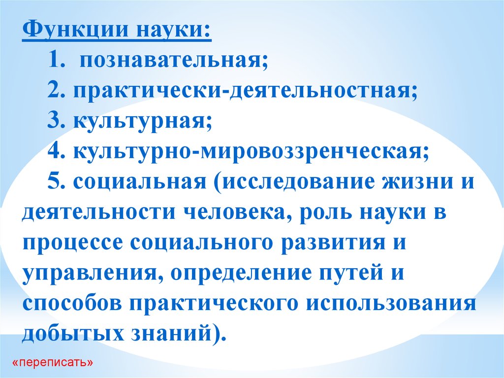 Функции науки:1. познавательная;