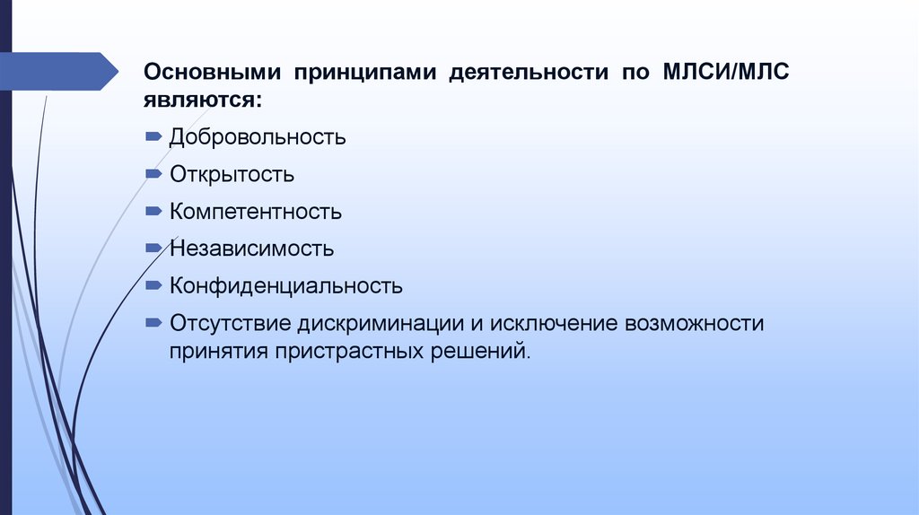 Основными принципами деятельности по МЛСИ/МЛСявляются:
