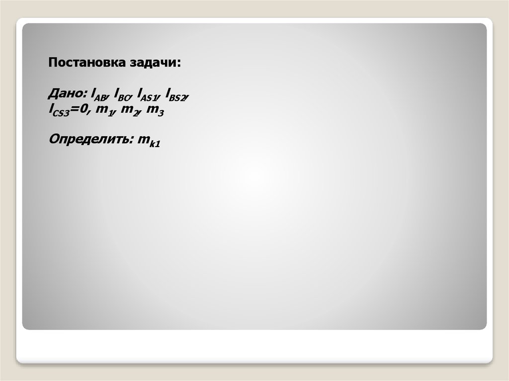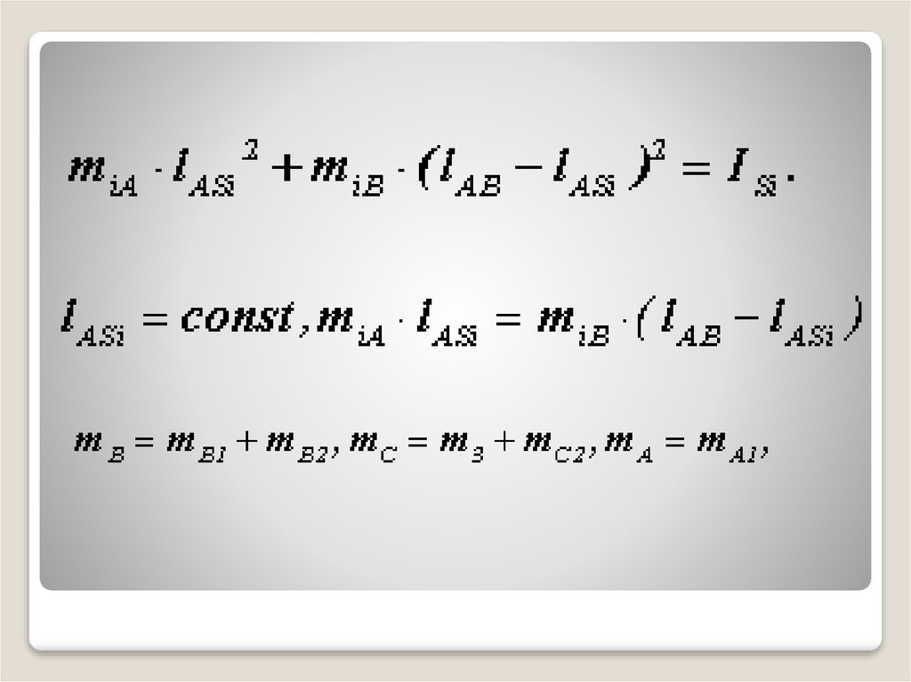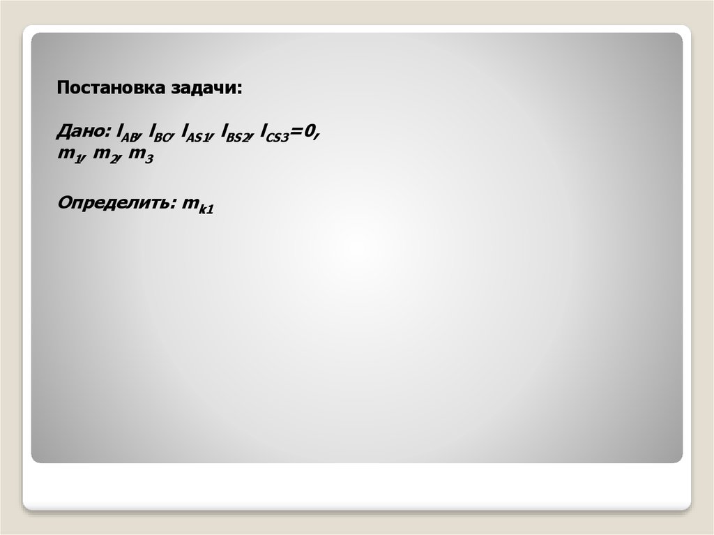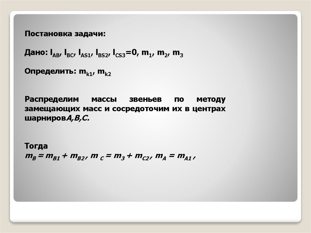 Постановка задачи:Дано: lAB, lBC, lAS1, lBS2, lCS3=0, m1, m2, m3