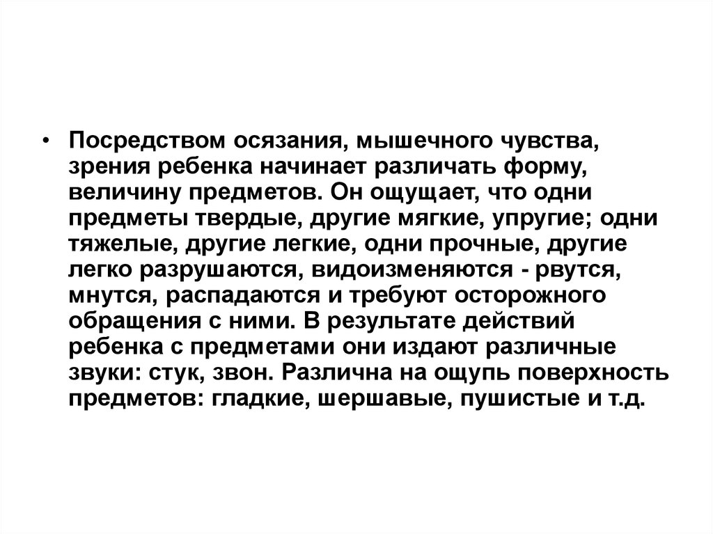 • Посредством осязания, мышечного чувства,зрения ребенка начинает различать форму,