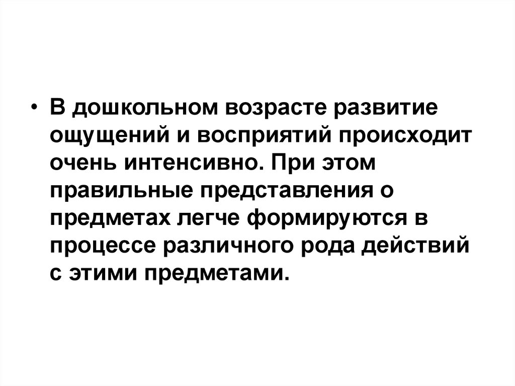 • В дошкольном возрасте развитиеощущений и восприятий происходит