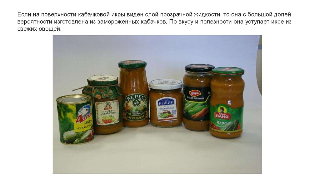 Если на поверхности кабачковой икры виден слой прозрачной жидкости, то она с большой долейвероятности изготовлена из замороженных кабачков. По вкусу и полезности она уступает икре из