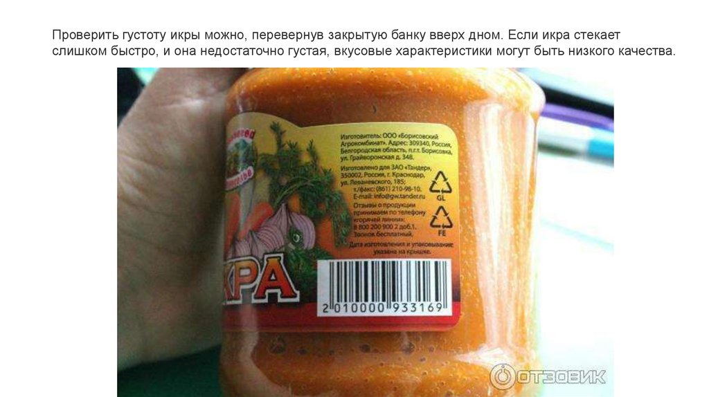 Проверить густоту икры можно, перевернув закрытую банку вверх дном. Если икра стекаетслишком быстро, и она недостаточно густая, вкусовые характеристики могут быть низкого качества.