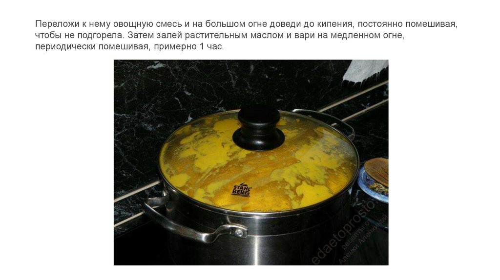 Переложи к нему овощную смесь и на большом огне доведи до кипения, постоянно помешивая,чтобы не подгорела. Затем залей растительным маслом и вари на медленном огне,