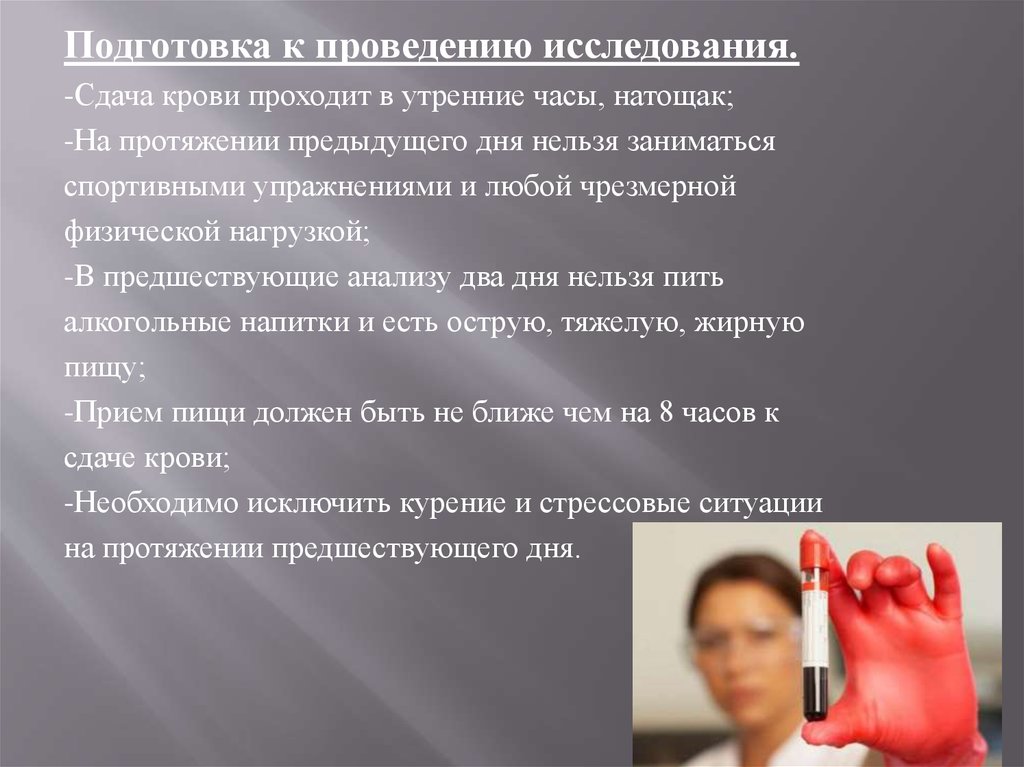 Подготовка к проведению исследования.-Сдача крови проходит в утренние часы, натощак;