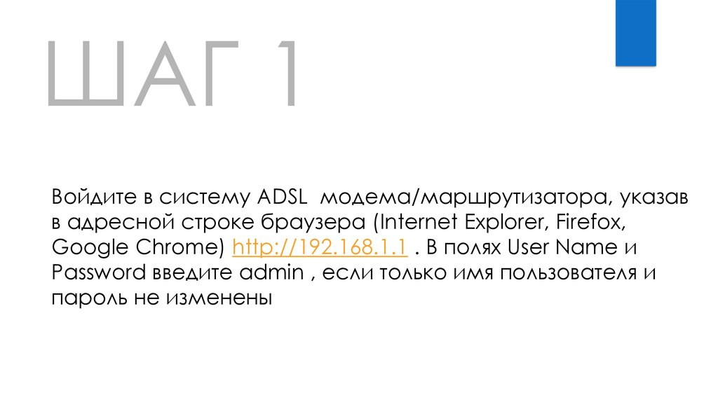ШАГ 1Войдите в систему ADSL модема/маршрутизатора, указав