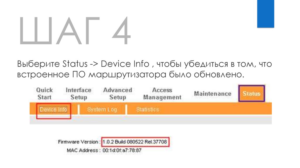 ШАГ 4Выберите Status -> Device Info , чтобы убедиться в том, что