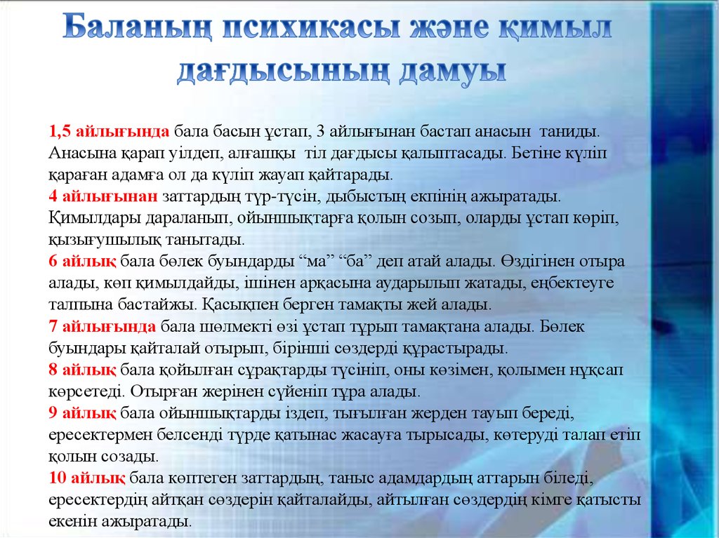 1,5 айлығында бала басын ұстап, 3 айлығынан бастап анасын таниды.Анасына қарап уілдеп, алғашқы тіл дағдысы қалыптасады. Бетіне күліп