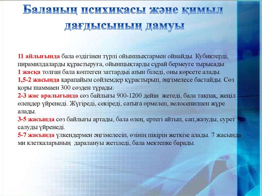 2-3 жас аралығында сөз байлығы 900-1200 дейін жетеді, бала тақпақ, жеңіл