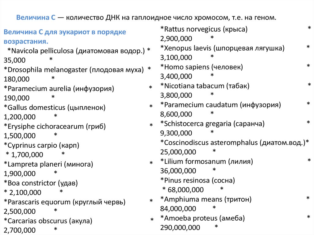 Величина С — количество ДНК на гаплоидное число хромосом, т.е. на геном.*Rattus norvegicus (крыса)