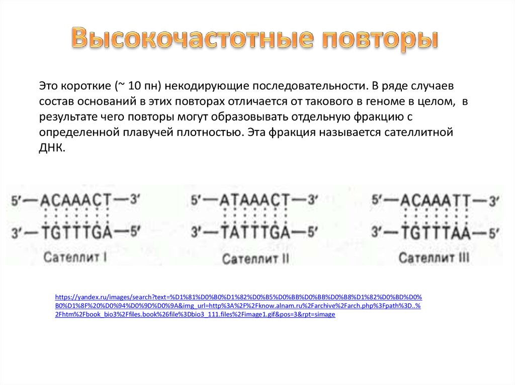 Это короткие (~ 10 пн) некодирующие последовательности. В ряде случаевсостав оснований в этих повторах отличается от такового в геноме в целом, в