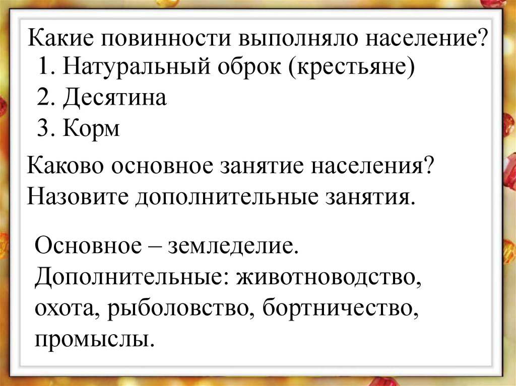 Какие повинности выполняло население?1. Натуральный оброк (крестьяне)