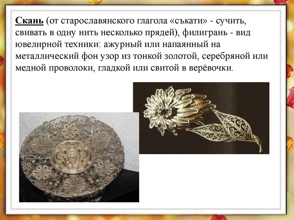 Скань (от старославянского глагола «съкати» - сучить,свивать в одну нить несколько прядей), филигрань - вид