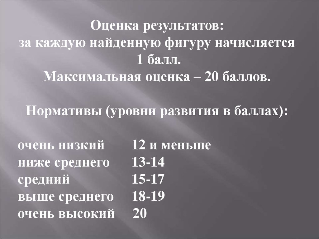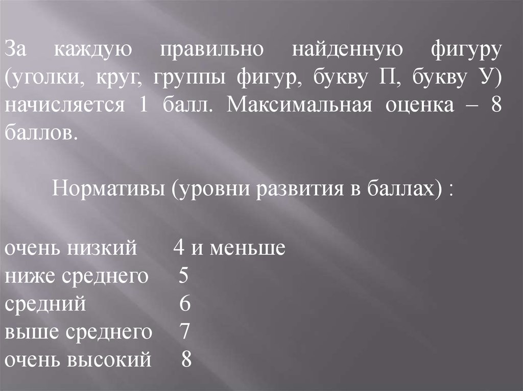 Оценка результатов:за каждую найденную фигуру начисляется